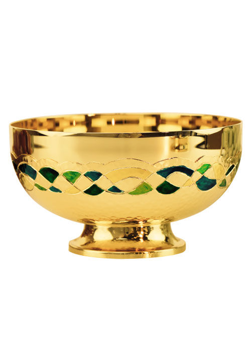 Attraktiv in der Optik präsentiert sich diese Hostienschale, die aus vergoldetem Messing gefertigt ist. Besonderes Augenmerk gebührt der teils polierten, teils gehämmerten Oberfläche, die im ziselierten Wellendekor mit grünen Emaille-Auflagen geschmückt ist. Die Hostienschale hat eine Gesamthöhe von 8,2 cm.