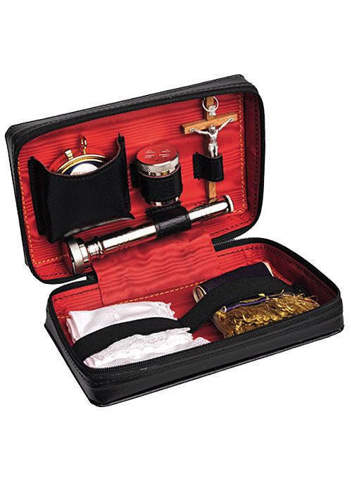 Diese Versehtasche beinhaltet alles Notwendige für den Versehgang. Die Versehtasche ist aus schwarzem Leder gefertigt und mit einem Reißverschluss versehen. Die einzelnen Teile werden sicher teils mit robustem Gummiband teils mit Riemchen aufbewahrt, so dass nichts verrutschen kann. Erwähnenswert ist das Ölgefäß, das durch den verschraubbaren Deckel vor dem Auslaufen der Flüssigkeit geschützt ist.