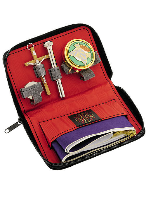 Diese Versehtasche in Wildlederoptik beinhaltet alles Nötige für den Versehgang und punktet vor allem durch ihr durchdachtes Ölgefäß, das mit einem Fingerring ausgestattet ist. In der relativ kleinen Versehtasche befindet sich neben einem vernickelten Aspergill eine vergoldete Pyxis, deren Oberfläche emailliert ist. Ergänzt wird die Versehtasche mit einem Kreuz, einer Versehstola sowie zwei Kelchtüchern.