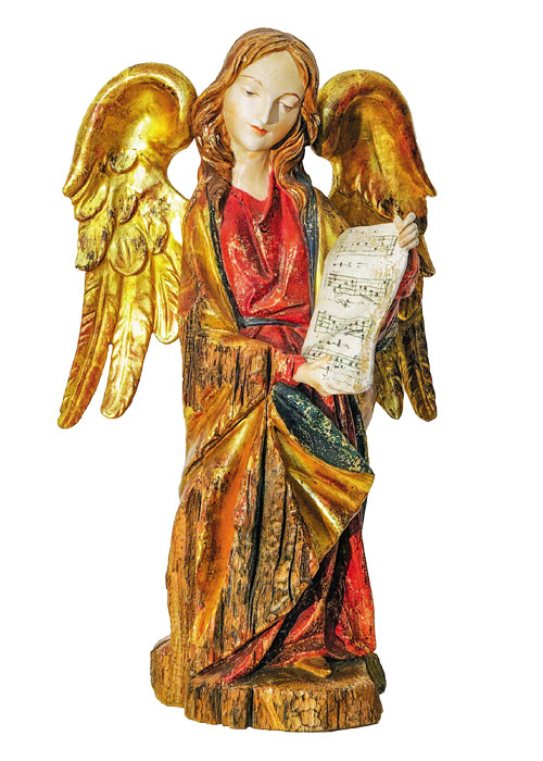 Handgeschnitzt, auf Kreidegrund antik gefasst und mit Blattgold verziert. Die Größe des Engels beträgt 50 cm.