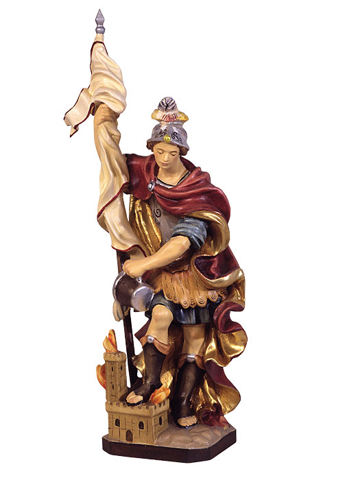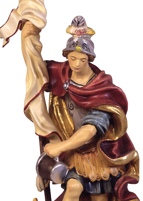 Holzgeschnitzter Heiliger Florian, coloriert, in der Größe 60 cm (ohne Fahne). Der Heilige Florian ist Schutzpatron von Österreich, der Seifensieder, Schornsteinfeger und der Feuerwehren. Er wird gegen bei Feuer und Überfltungen aufgerufen.