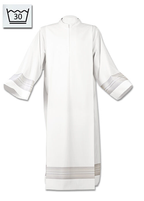 Sehr schöne Albe aus Wolltrevira, waschbar, mit vorderem Reißverschluss und kleinem Stehbundkragen. Elegant wirkt die gewebte Bordüre an Ärmeln und Saum sowie die gelegten falten auf Vorder- und Rückenteil.