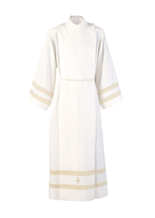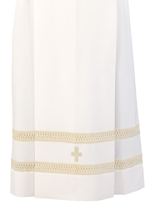 Albe aus Wolltrevira, mit vorderer und rückwärtiger Faltenpartie; die Albe hat unten und an den Ärmeln eine elegante Stikerei mit Kreuz.
