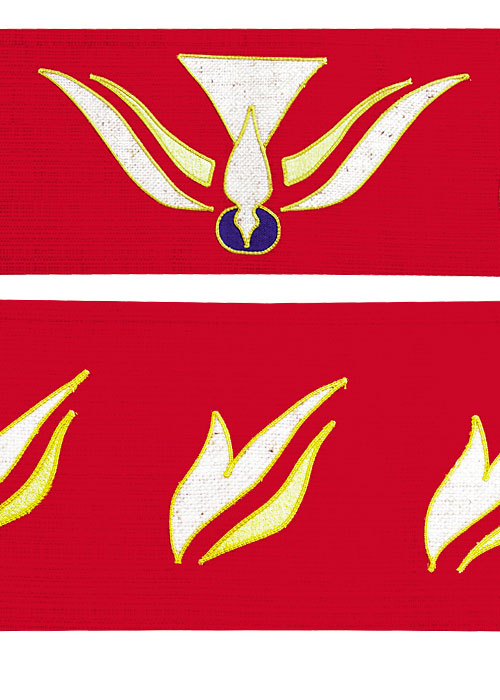 Der passende Schmuck für die Pfingstfeierlichkeiten! Antependium aus Wolltrevira mit gesticktem Pfingstmotiv: das Antependium hat eine Größe von 250 x 25 cm und wird mittels Klettband befestigt.
