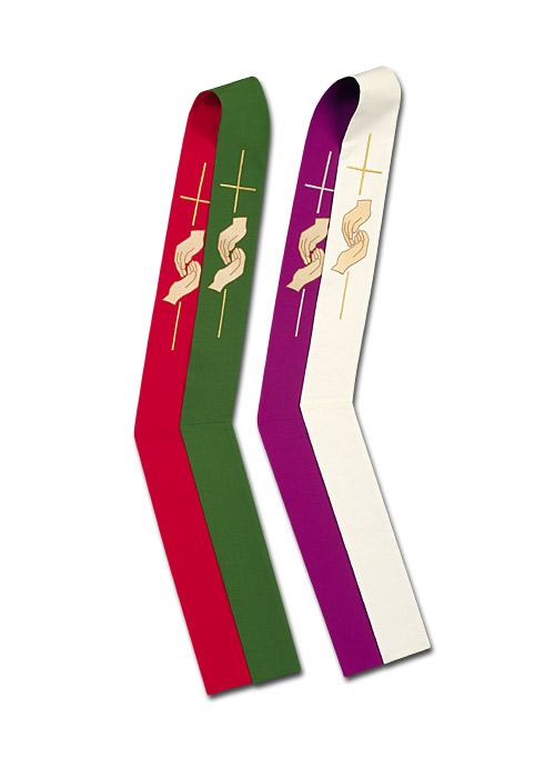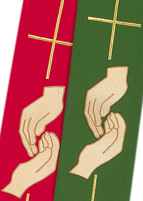 Hochwertige, wendbare Diakonstola aus Wolltrevira (rot-grün), mit gesticktem Motiv "Helfende Hände".
