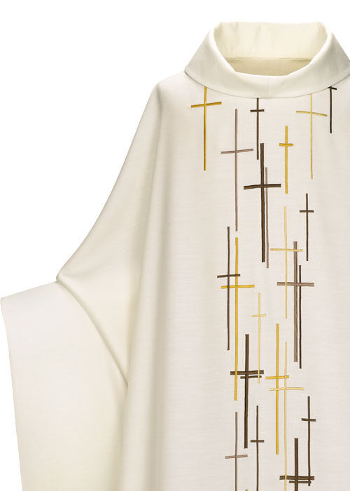 Die maschinell gestickten Kreuze in der Mitte der Kasel sind mehrfarbig gearbeitet und geben dem Messgewand eine moderne und doch zeitlose Erscheinung.