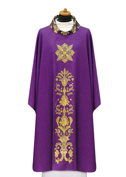 Es bietet eine Kasel an, die aus Wolltrevira gearbeitet ist und auf der Vorderseite mit einer reichen Goldstickerei verziert ist. Ein Hingucker ist der Kragen aus italienischem Brokat.