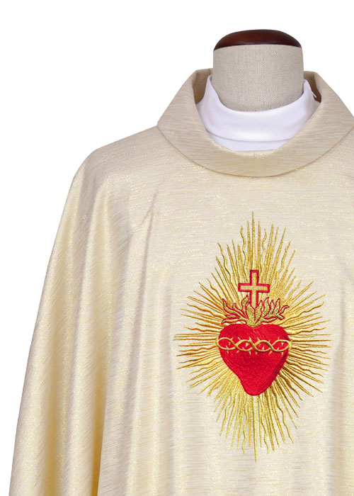 Festliche Herz-Jesu-Kasel mit appliziertem Herz-Jesu-Motiv. Die Kasel ist ungefüttert und mit einer Goldborte paspoliert.