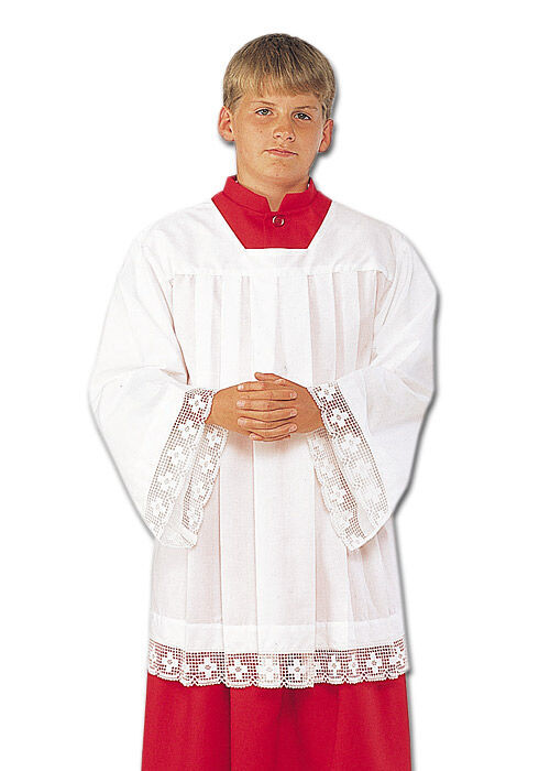 Ministranten-Chorhemd aus 100% Cottonova mit eckigem Ausschnitt und gelegten Falten. Das Ministranten-Chorhemd ist an Saum und Ärmel mit einer dekorativen Spitze eingefasst. Die Qualität des Ministranten-Chorhemdes ist aus 100% Cottonova und muss nach dem Waschen gebügelt werden.
