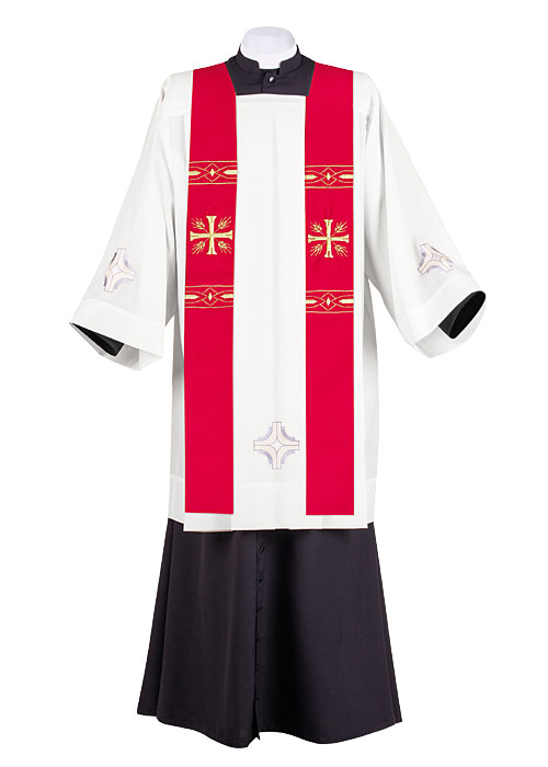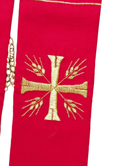 Rochettstola aus Wolltrevira, mit gesticktem Kreuz-Ähren-Motiv; die Rochettstola ist in den Farben grün und rot lieferbar.