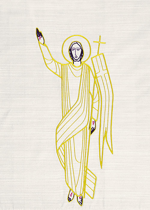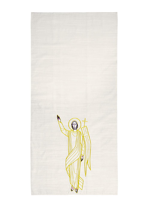 Gefütterter Wandbehang mitgesticktem Motiv des Auferstandenen aus Goldgarnen. Die Figurengröße beträgt 80 cm. Der Wandbehang hat einen Tunneldurchzug für die Stange. Seine Größe beträgt 185 x 89 cm.