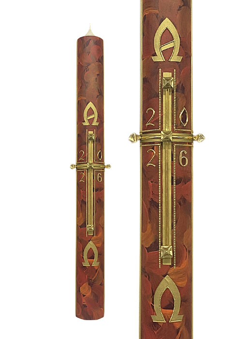Diese Osterkerze hebt sich optisch von vielen Osterkerzen ab. Hauptaugenmerk ist die weinrote Wachsplatte, die mit rot-, gelb-, ocker- und orangefarbigen Tönen bemalt ist und den Bezug zur Passion und Auferstehung herstellt. Mit dieser Kerze erhalten Sie ein künstlerisch hochwertiges Einzelstück, da die Pinselstriche und die Anordnung der Farben nie 100% identisch sind.