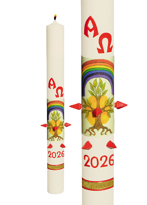 Gott ist unsere Zuflucht und Stärke. Dieser Spruch findet Eingang in dem ausdrucksstarken Motiv dieser Osterkerze, die einen Regenbogen zeigt, der sich schützend über den Baum des Lebens, das Leben selbst, ausbreitet.