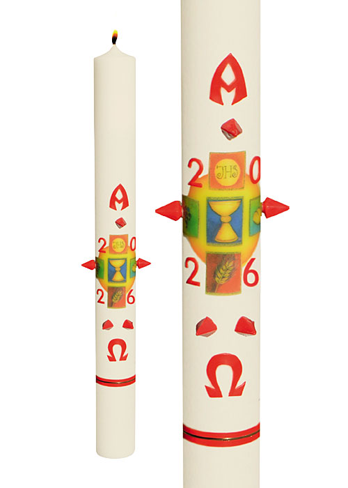 Die Osterkerze ist in den Größen 60 x 6 cm, 60 x 8 cm, 80 x 8 cm und 100 x 10 cm lieferbar.