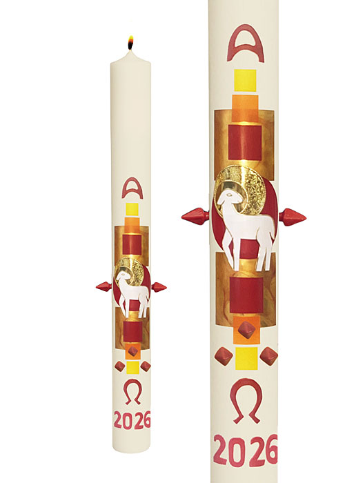 Diese Osterkerze, betitelt "Seht, das Lamm Gottes, das hinwegnimmt die Sünde der Welt", zeigt die Botschaft der Osternacht: Jesus ist am Kreuz gestorben, auferstanden und hat die Sünde der Welt auf sich genommen.