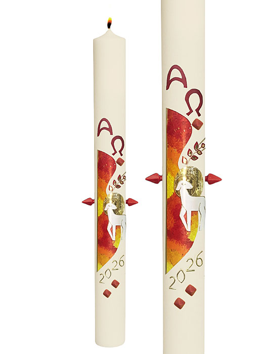 Sehr hochwertige Osterkerze mit handbemalten Hintergrund sowie Lamm Gottes Darstellung aus Wachs.
